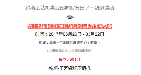 2017年3月20-22日,一年一度的世界石油裝備大會cippe2017將在北京·中國國際展覽中心(新館)召開。我國螺桿壓縮機領(lǐng)先企業(yè)鮑斯股份(展位號W3647)將亮相現(xiàn)場,展示其先進的螺桿壓縮機技術(shù)。