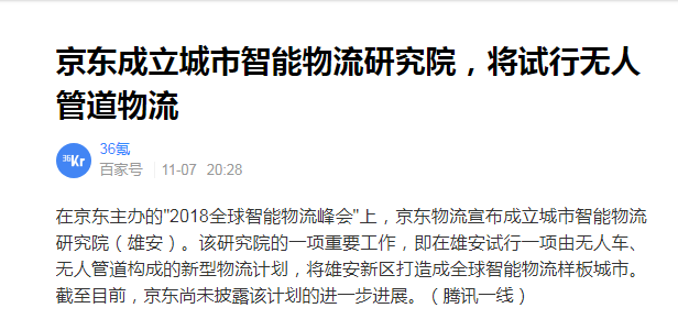 事實上,基礎(chǔ)市政設(shè)施往往在城市規(guī)劃時就已成型,一座成熟城市若想將這一尚未投入過實用的計劃從零施行,將面臨較大阻力。政府層面的許可,意味著京東物流有可能在不遠(yuǎn)的將來進入下一步。但接下來在細(xì)化管道規(guī)劃、與市政部門協(xié)同、費用究竟誰來負(fù)擔(dān)的問題上,可能仍有待京東方面與雄安新區(qū)政府之間不斷磋商協(xié)調(diào)。