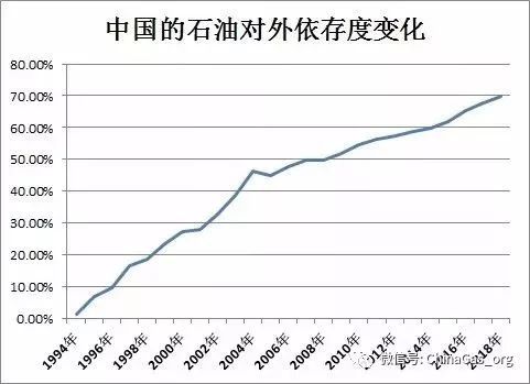 自2014年以來,中國的能源形勢發(fā)生了很大變化,尤其是油氣對外的依存度逐年攀升。2014年-2017年,中國石油對外依存度分別為59.5%、61.8%、65.4%、67.5%。2018年則創(chuàng)下50年新高,根據(jù)BP能源統(tǒng)計年鑒:2018年中國原油加工量和石油表觀消費量雙破6億噸,石油對外依存度高達70%。