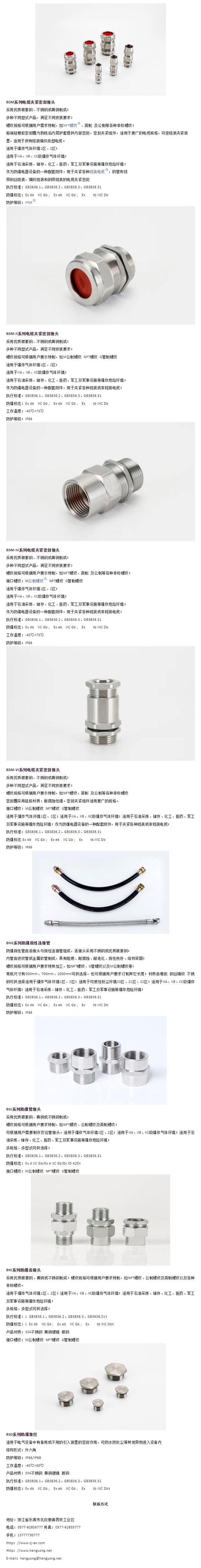 公司專業(yè)生產(chǎn)電纜密封接頭、防爆撓性連接管、防爆填料函,防爆管件等產(chǎn)品。嚴(yán)格按照ISO9001質(zhì)量管理體系組織生產(chǎn)、形成了從研發(fā)、生產(chǎn)到成品等各個(gè)環(huán)節(jié)品質(zhì)的保證。產(chǎn)品廣泛用于石化,海油,平臺(tái),化工,醫(yī)藥,煤礦,煉鋼,船舶,軍工等領(lǐng)域,過(guò)硬的品質(zhì)獲得國(guó)內(nèi)外客戶的一致好評(píng)。