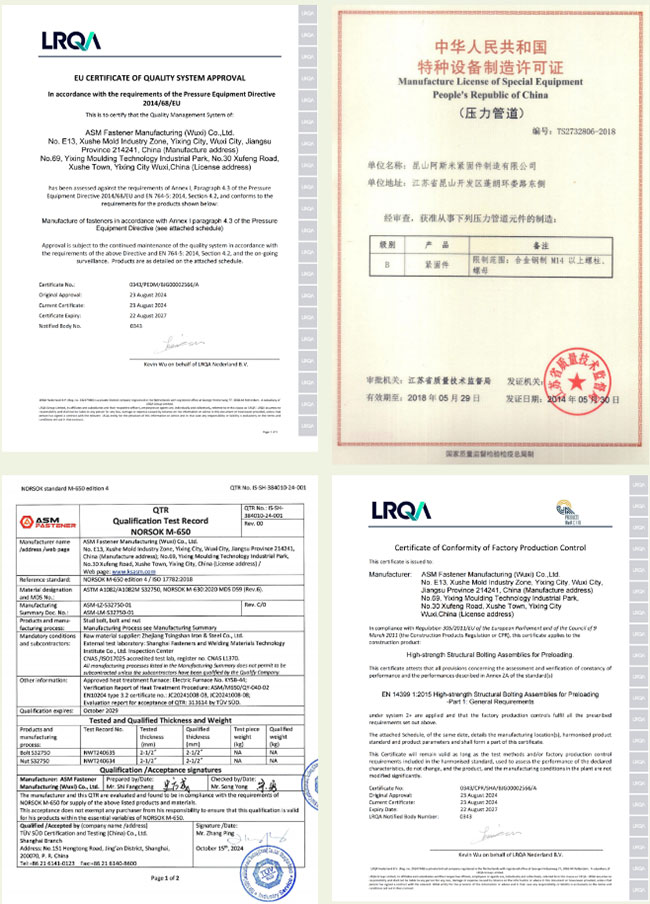 阿斯米為中國區(qū)域ASTM緊固件制造企業(yè),FPSO海上浮式石油天然氣生產(chǎn)儲卸裝置緊固件配套商,中國特檢院特種設(shè)備制造許可(壓力管道)TS-緊固件制造工廠。產(chǎn)品通過挪威石油行業(yè)NORSOK M650認證,歐盟CE認證。取得美國石油協(xié)會石油、天然氣行業(yè)API 20E碳鋼及合金鋼螺栓和API 20F防腐蝕螺栓認證。經(jīng)過壓力設(shè)備指令PED4.3和建筑指令CPR14399及15048實地認證,工廠可自主出具EN10204 3.1證書。
